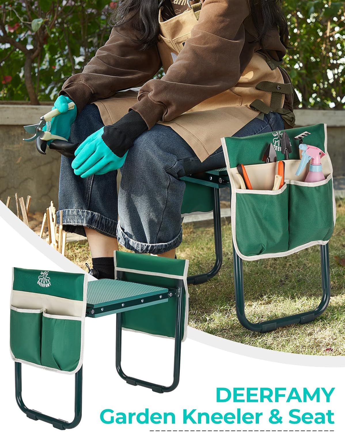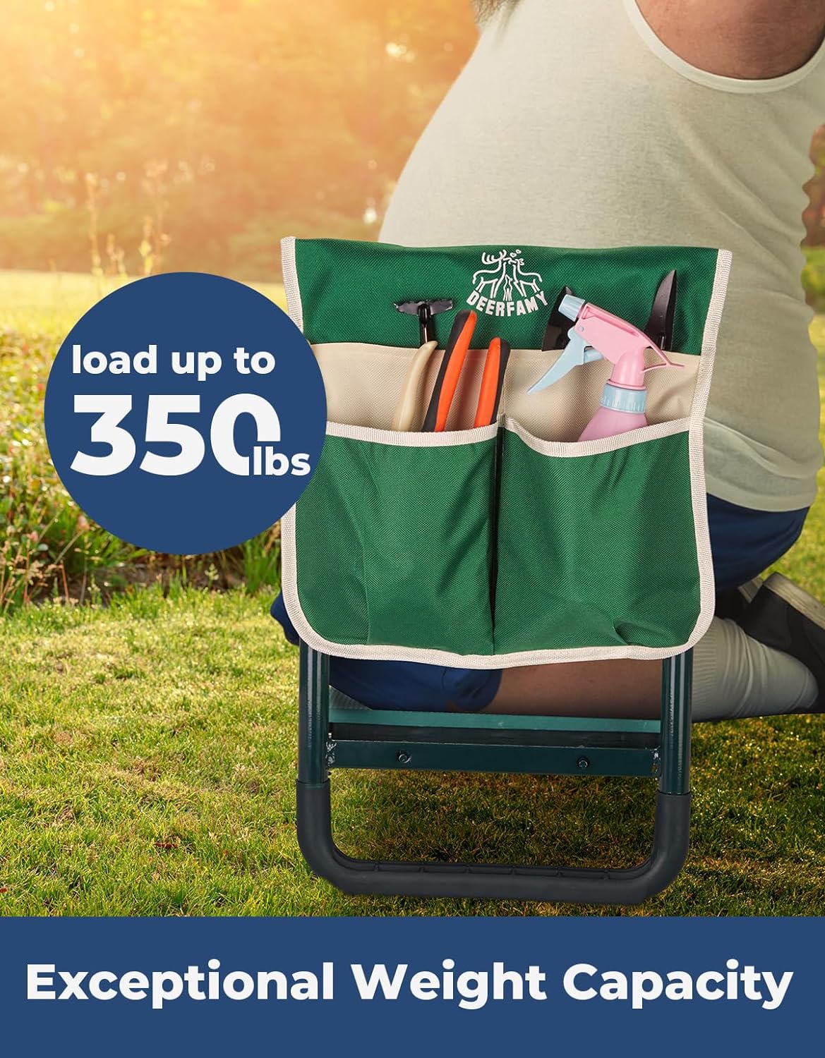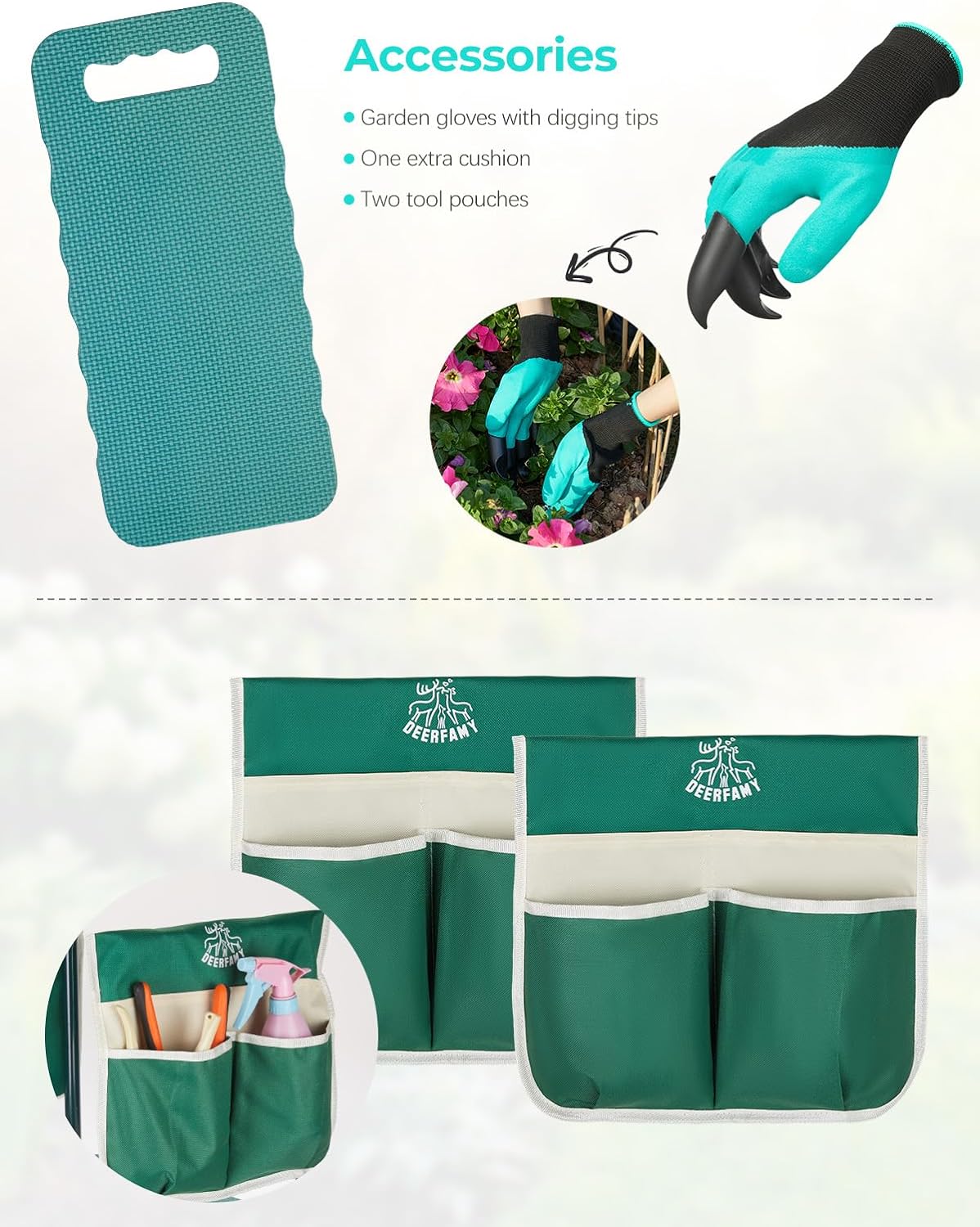 DEERFAMY Garden Stool 10.2″ Width, Garden Kneeler and Seat Load Cap 350 lbs, Heavy Duty Gardening Stool with Extra Kneeling Pad, 2 Tool Pouches, Claw Gloves, Gift for Women Seniors, GreenCreate a new description for this product from the title with 500 characters