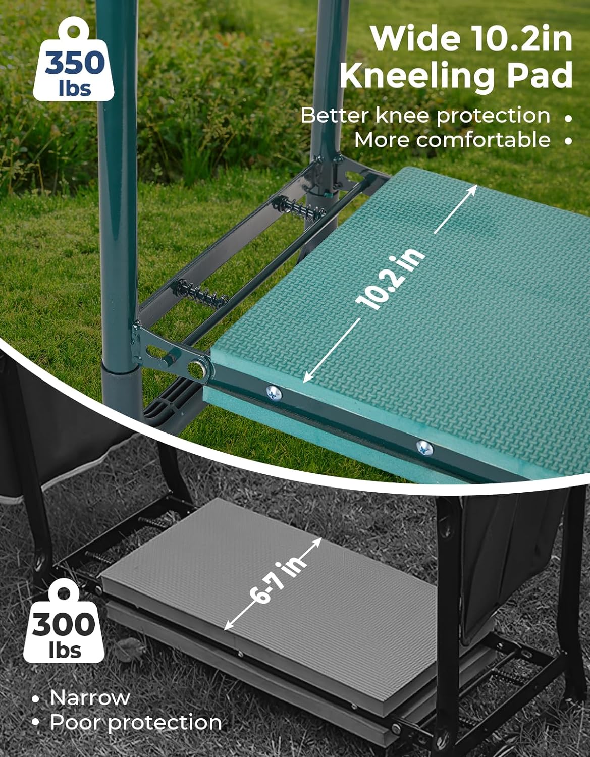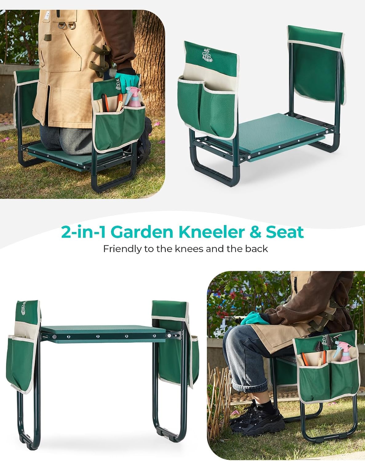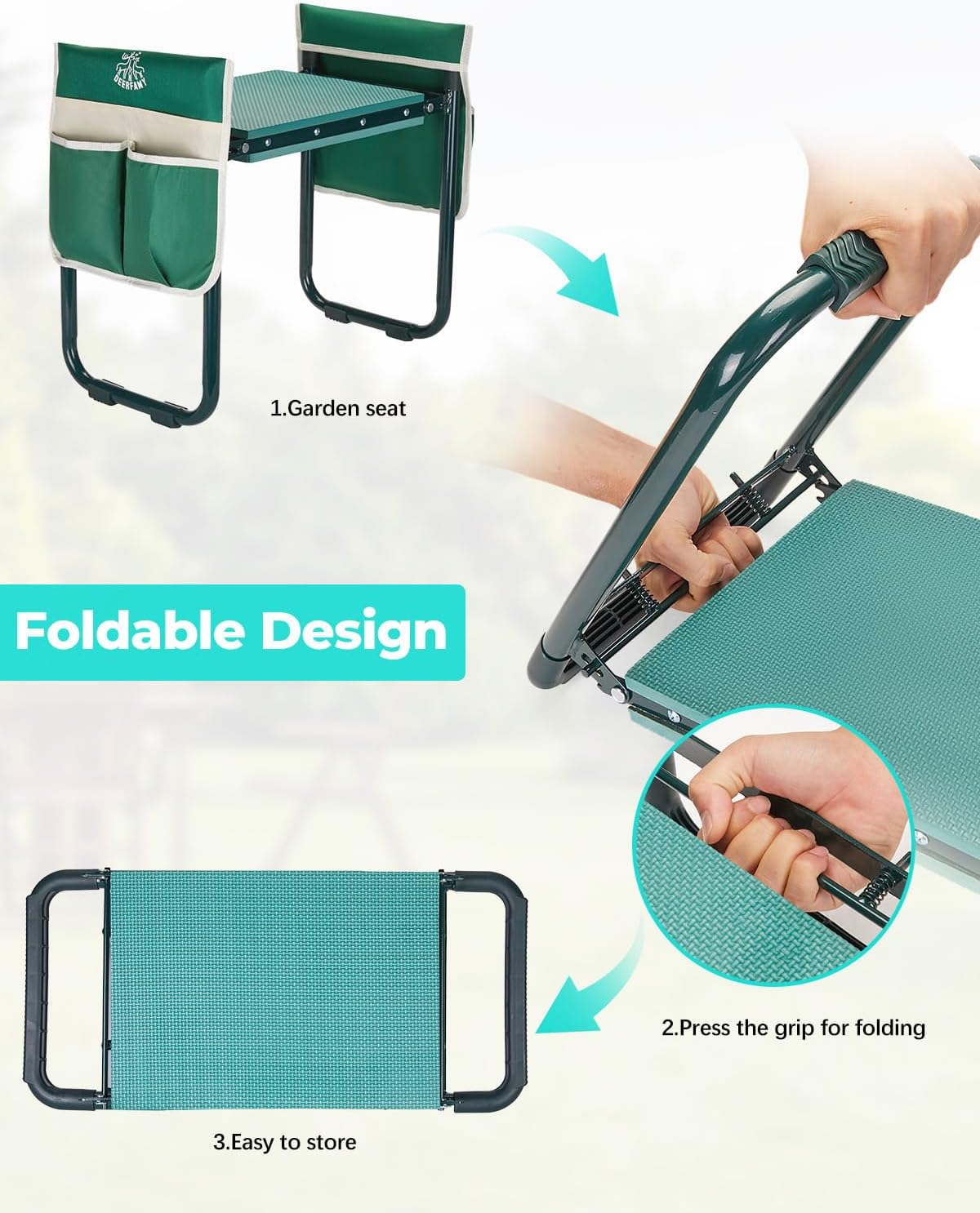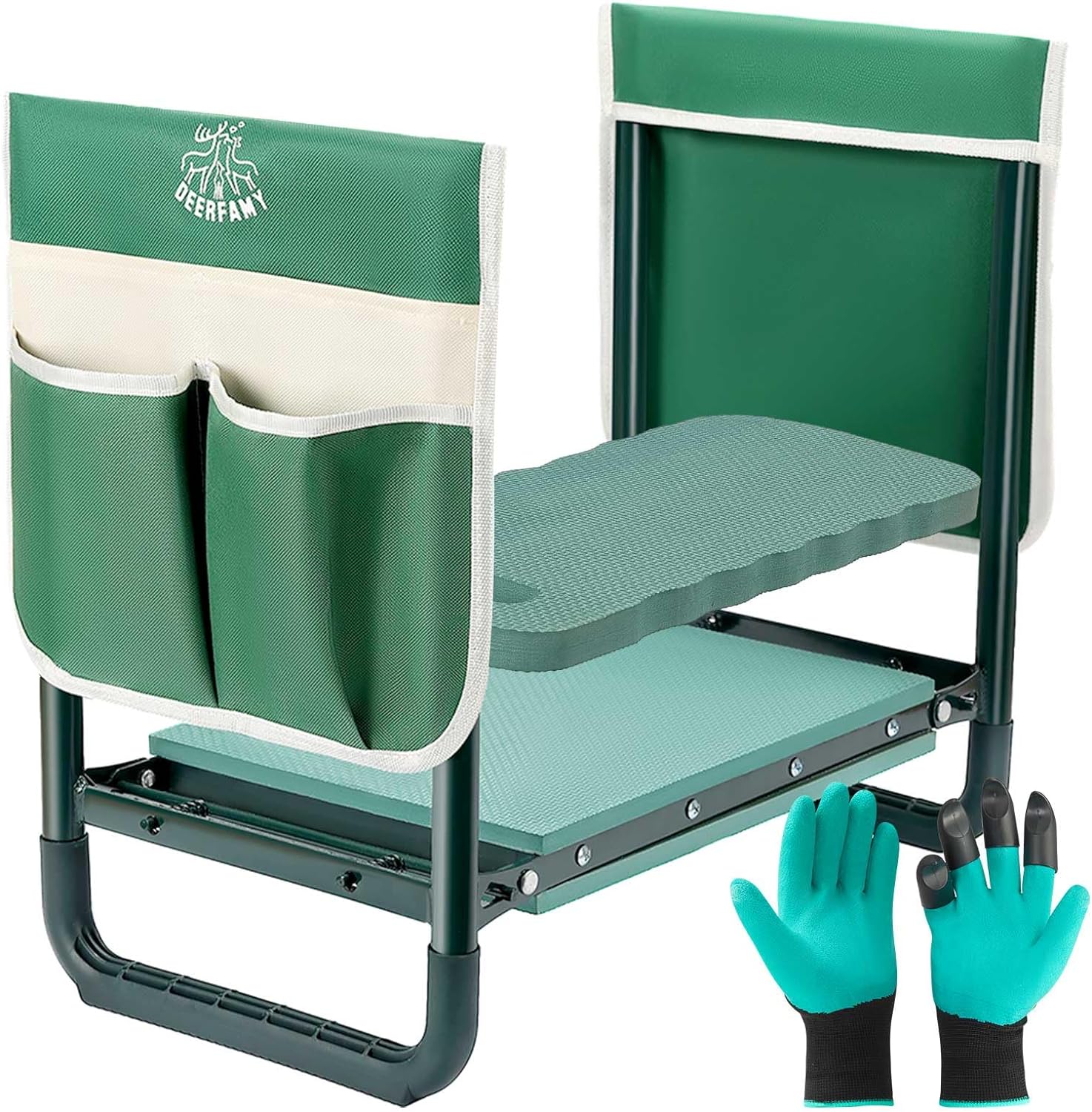 DEERFAMY Garden Stool 10.2″ Width, Garden Kneeler and Seat Load Cap 350 lbs, Heavy Duty Gardening Stool with Extra Kneeling Pad, 2 Tool Pouches, Claw Gloves, Gift for Women Seniors, GreenCreate a new description for this product from the title with 500 characters