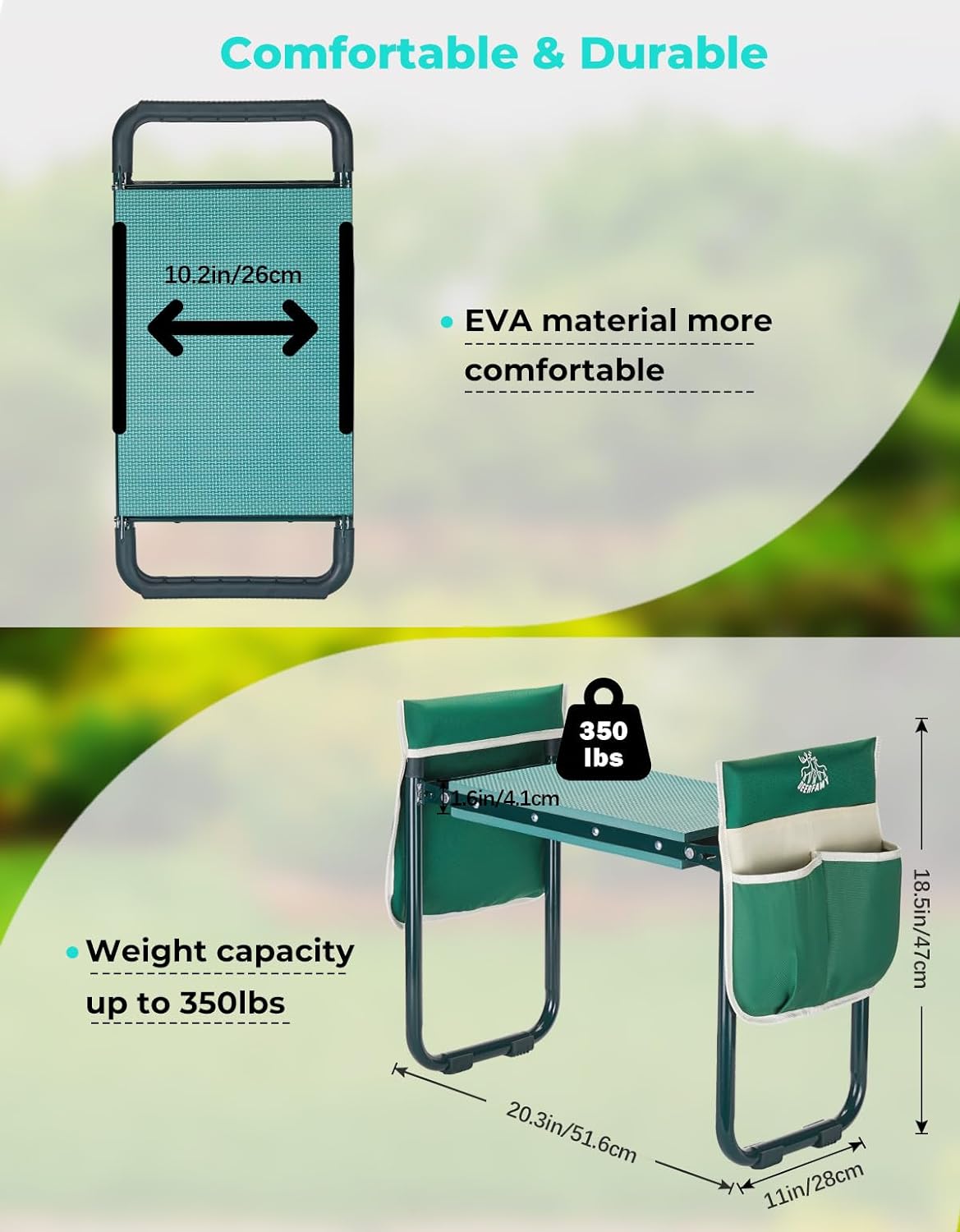 𝙇𝙞𝙜𝙝𝙩𝙬𝙚𝙞𝙜𝙝𝙩 𝙖𝙣𝙙 𝙎𝙩𝙪𝙧𝙙𝙮: This foldable garden seat has a compact size, which can save storage space. Only 6 pounds in weight, this gardening bench is portable and easy to use. It is made of high-strength steel with a load capacity of up to 350 lbs.